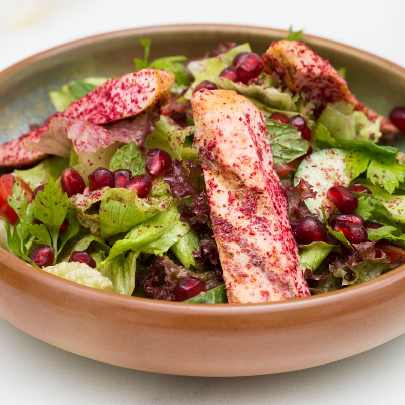 (391 سعرة حرارية)خضروات طازجة , دجاج متبل مع الرمان والصوص الخاص