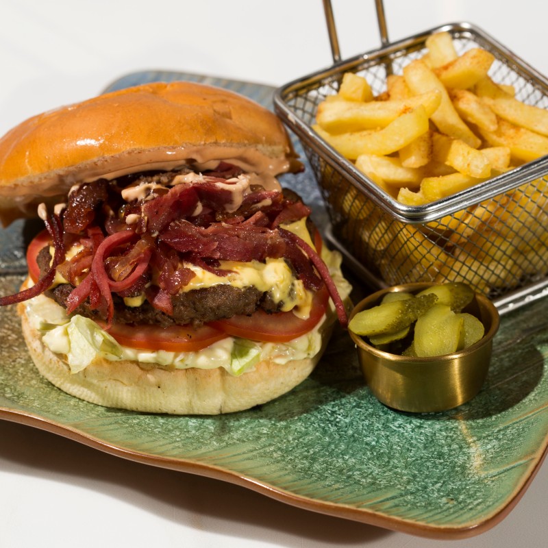 (674 سعرة حرارية)2 قطع برجر انجوس مشوي , صوص البرجر الخاص, خس , طماطم , بيكون , بصل كارماليز لحم مدخن ,