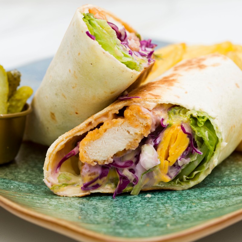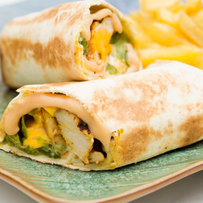 (496 سعرة حرارية)خبز التورتيلا المحشو بالدجاج المشوي المتبل بعناية والخس الامريكي وجبن الشيدر، يقدم مع صوص الرانش.