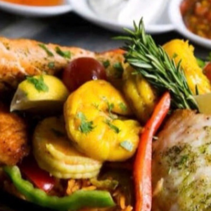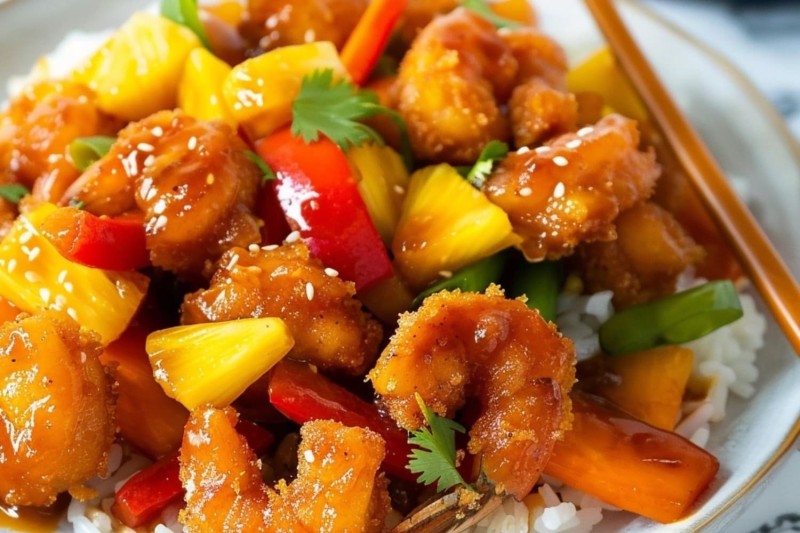الجمبري المقلي مع صوص السويت آند سور والخضروات المشكله