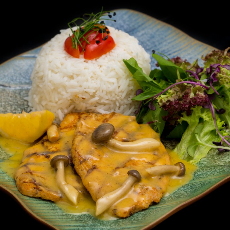 (619 سعرة حرارية)الدجاج المشوي مع صوص الليمون والخضروات الطازجة مقدم مع الأرز