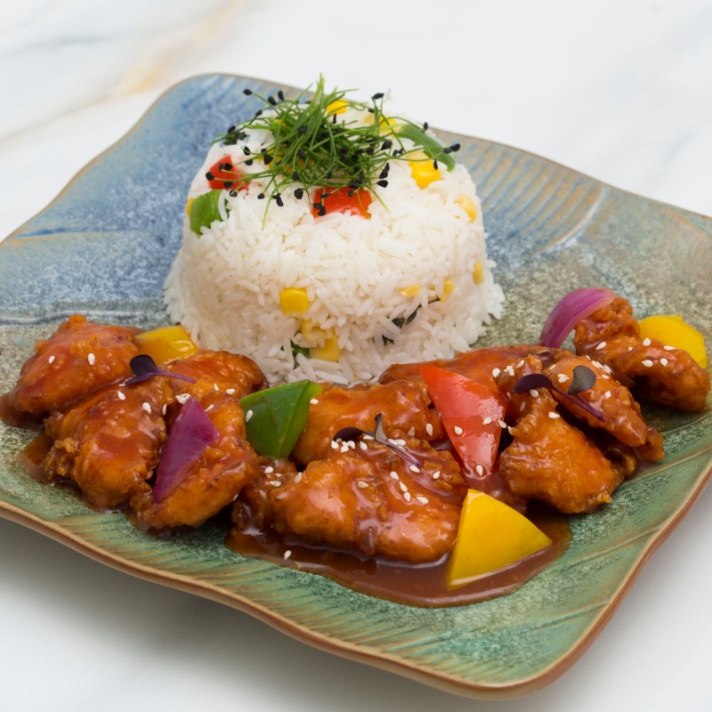 (1097 سعرة حرارية)تناغم مزيج الدجاج المقلي والخضروات الطازجة مع الصوص المميز مقدم مع الأرز