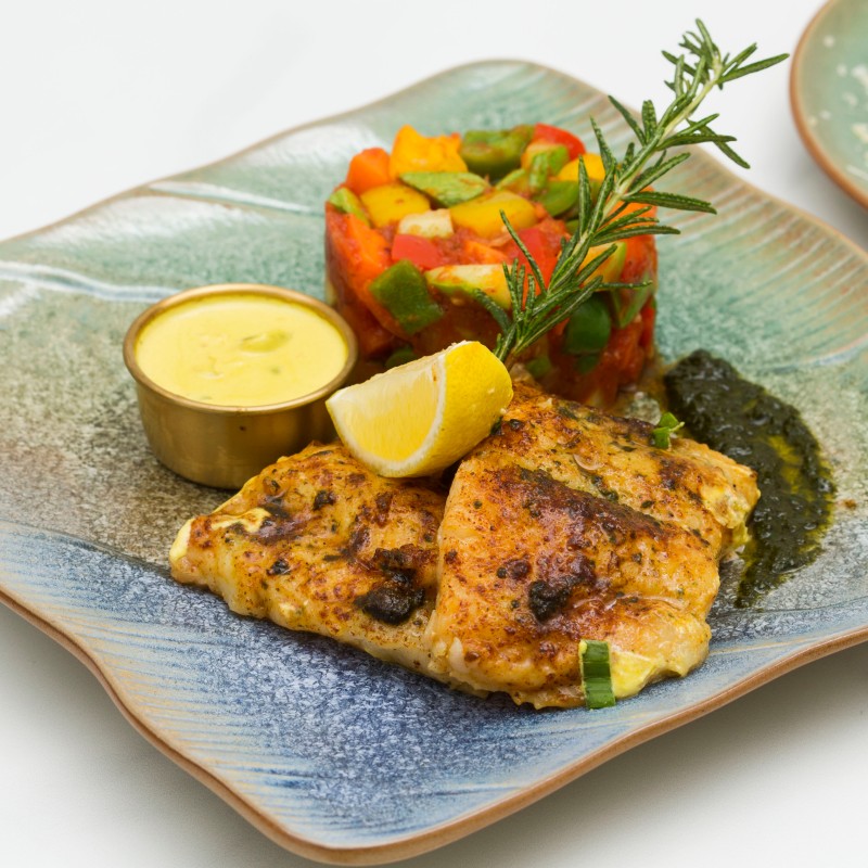 (604 سعرة حرارية)شرائح السمك المشوي بالنكهة المميزة والخضارالريتاتوي الشهيروصوص الليمون
