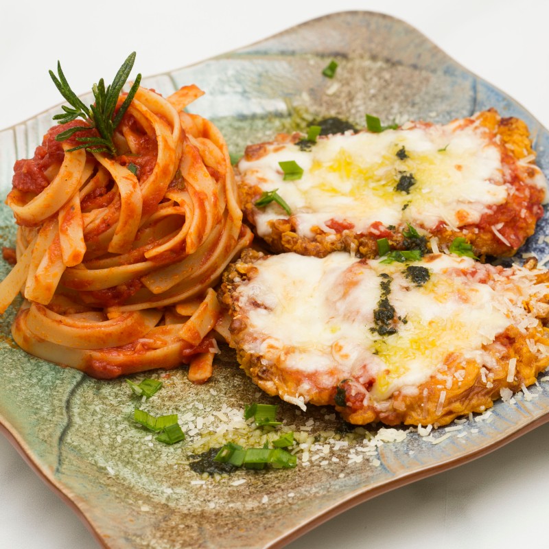 (821 سعرة حرارية)الدجاج المقلي بالتتبيلة المميزة وصوص البومودورو الشهير مغطي بطبقة من جبن البارميزان