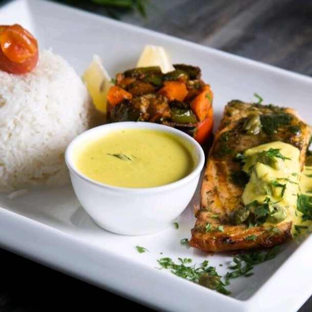 (1321 سعرة حرارية)اسيتك السلمون الفاخر يقدم مع الخضار الريتاتوي والرز الابيض وصوص الليمون