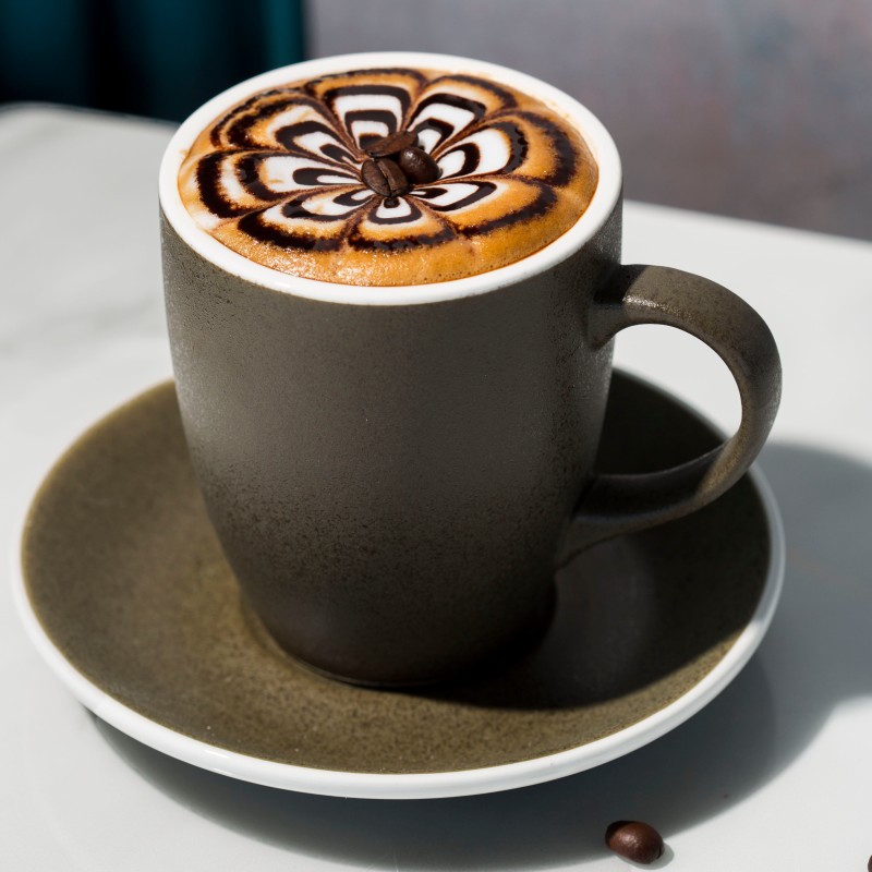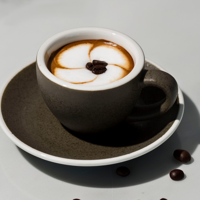 (110 سعرة حرارية)مزيج من الحليب ذو الرغوة الدقيقة يُسكب فوق جرعة واحدة أو مضاعفة من الإسبريسو