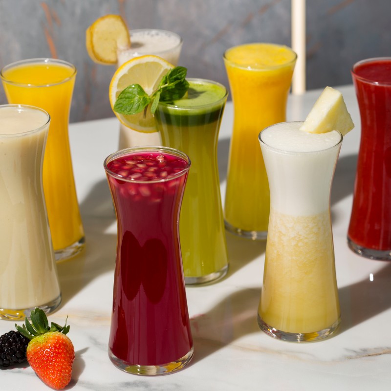 (115 سعرة حرارية)مانجو . برتقال. الفراولة . الجوافة. رمان . أناناس . ليمون نعناع . موز مع حليب